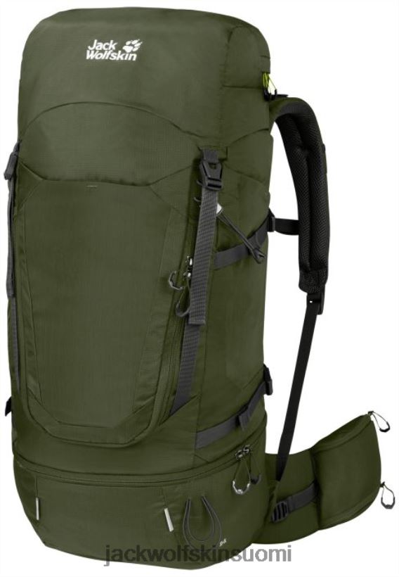 Highland Trail 55 + 5 Miesten vaelluspakkaus on valmistettu kierrätetyistä materiaaleista ja varustettu Korkeuden säädettävä X-siirron takajärjestelmä. Järjestelmä on erittäin mukava, tarjoaa hyvän selkänojaan ja tekee raskaiden kuormien kuljettamisesta yllättävän helppoa. Kansitaskussa on erityisen pitkä vetoketju ja se aukeaa leveäksi, jotta löydät tarvitsemasi nopeasti. Voit kantaa vesipullosi vyötäröhihnan erityiskoteloon, ja jos haluat käyttää vesirakon, siinä on säilytyspussi. Päälokeroon pääsee ylhäältä tai etumatkan kautta. Pakkauksen edessä on suuri joustava mesh -tasku, joka tarjoaa kätevän paikan märän takin säilyttämiseen, kun sää selviää. Takaosan pituus on säädettävissä.